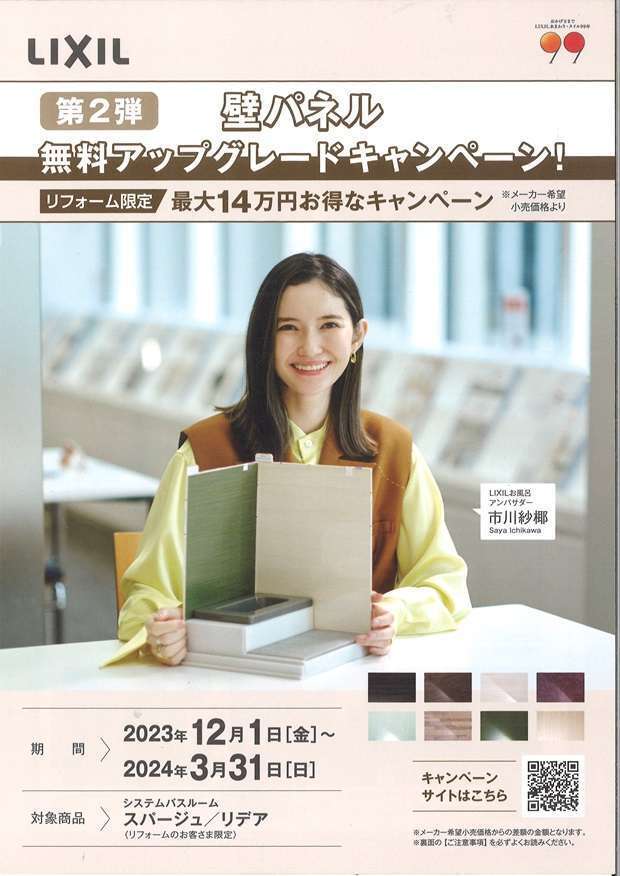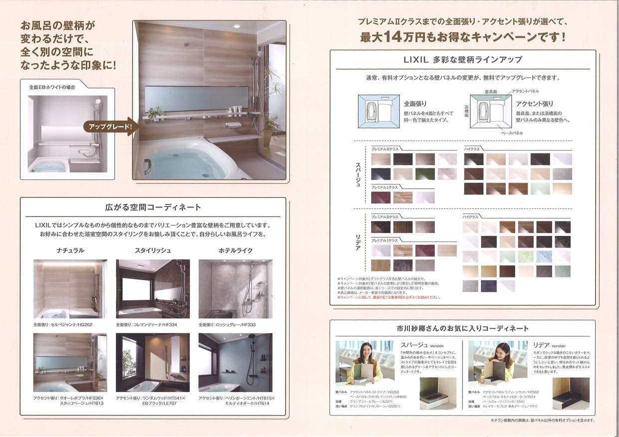 ただ今、LIXILシステムバスルーム スパージュ・リデアをご契約いただきますと、壁パネルが無料アップグレードキャンペーン!
