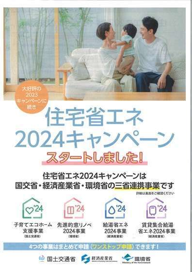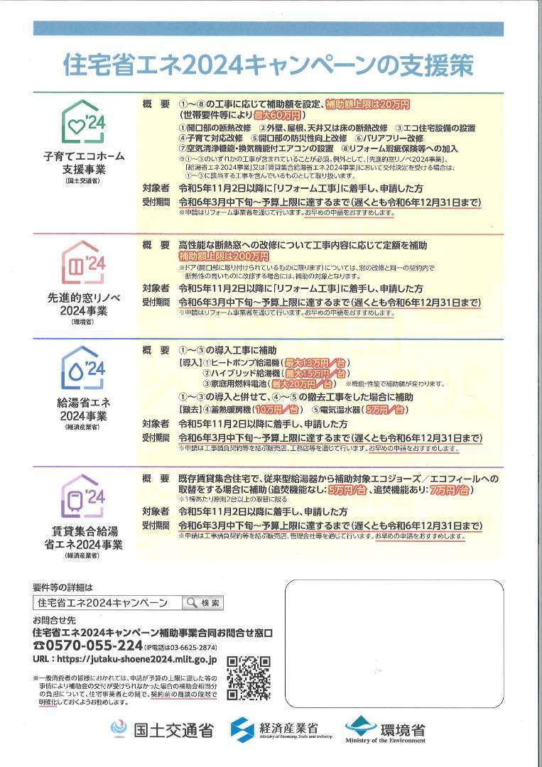 国の超大型補助金①先進的窓リノベ2024事業・②子育てエコホーム支援事業(子育て世帯に限らず、リフォームはどなたでも申請できます)スタートしました。どうぞ活用ください。