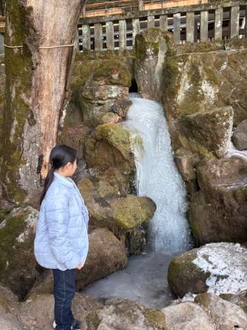 2026年2月初旬に長野県の諏訪大社へお参りへ。御柱の後ろにある小さな滝は凍ってました。