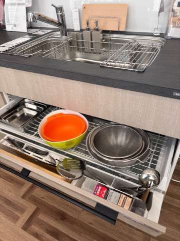 システムキッチンの展示では、実際に調理に必要な器具やラップやボウル、タッパーなど収納してあり、イメージわきますね!大きいボウルってどこに収納する?っていつも悩む主婦歴23年の私。