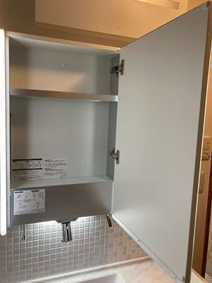三面鏡の裏はたっぷりの収納になっており、収納トレイのレイアウトが5センチ刻みで変えられ、使い勝手で自由に配置できます。