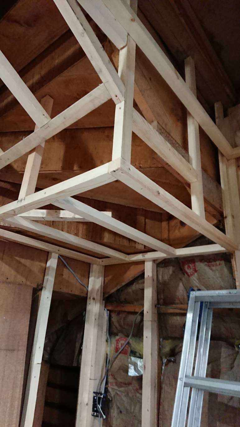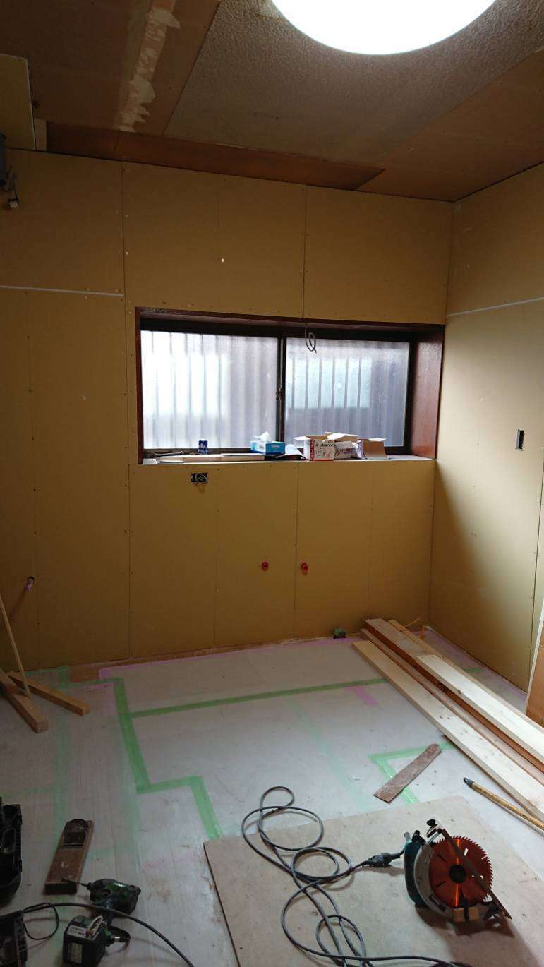 ドアが収まる枠の工事や階段下の木枠工事が終わりました!窓のところは、システムキッチンが収まるところです!